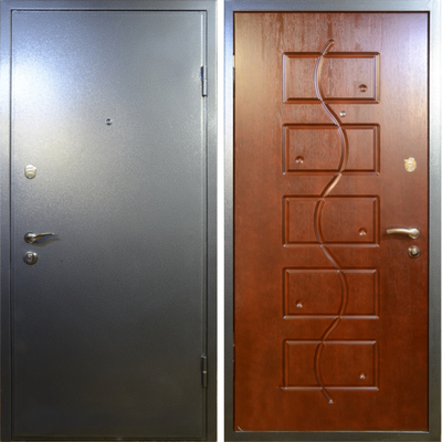 Для оформления внешней стороны входной двери было использовано серебряное порошковое напыление. Внутри дверь отделана при помощи МДФ. Предусматриваются разные варианты фрезеровки и покраски древесноволокнистой плиты. Фурнитура изделия выполняет свои основные функции достаточно хорошо и может быть заменена на более дорогую. Сочетание древесных плит в этой двери с порошковым напылением смотрится весьма гармонично и элегантно. Такая модель хорошо будет выглядеть в помещения рабочей и жилой направленности, обеспечив комфорт, защиту и эстетичное оформление.